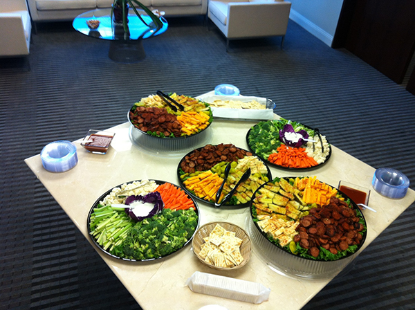 An assortment of Turkey Deluxe, Ham and Cheese, Hoagie Supreme, Chicken Salad, and Tuna Salad, served on an assortment of French rolls, sliced honey wheat, and marbled rye. Topped with leaf lettuce and sliced tomatoes. Mayonnaise and deli mustard served on the side.